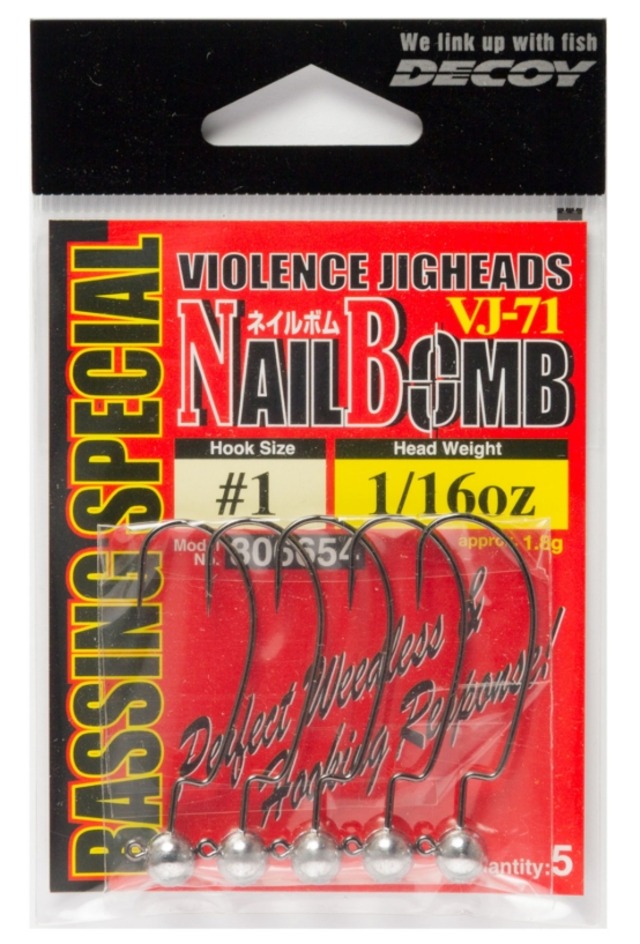 各ウェイト、フックサイズにおいて使い勝手が良くなるよう細部にまでこだわった専用設計のオフセットジグフックを採用し、ウィードレス効果とフッキング性能を最高水準で両立させた、元祖オフセットジグヘッド「ネイルボム VJ-71」。スイミング時の軽いローリング、シェイク時にはきっちりとローリングするこだわりの設計で、トーナメンターから陸っぱり派、初心者まで納得の使用感が得られます