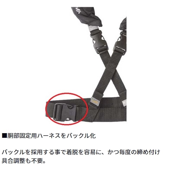 手動膨脹式ライフジャケット。より簡単に着用ができるバックル仕様。